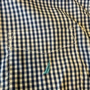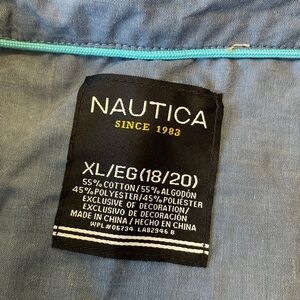 Stylish blue checkered button-up shirt by Nautica. Features a classic collar and button cuffs.