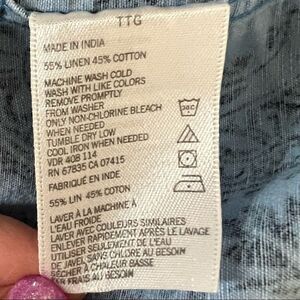 Comfortable cotton and linen blend. This shirt was always professionally cleaned so it looks like new. No flaws.