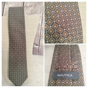 Nautica Brown Blue Geometric Woven Men's Tie Necktie Silk Made in USA Formal
