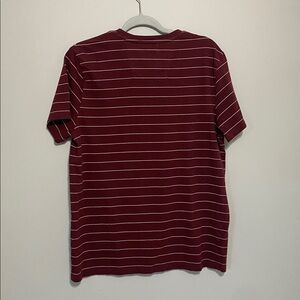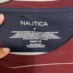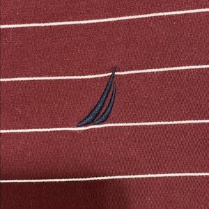 Burgundy tee with white stripes. Nautica logo on chest. Casual and stylish.