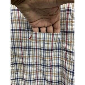 Nautica Button Down Shirt Men's Plaid 100% Cotton Long Sleeve Size XXL Preowned item unless stated. All measurements are taken laying flat. This is to help make sure you get the best fit please take advantage of the measurement photos. If there are any imperfections they will be noted in photos (ex. rips, tears, holes or spots will be noted in photos.) Enjoy!