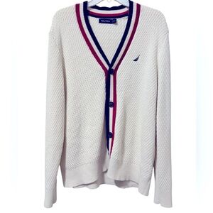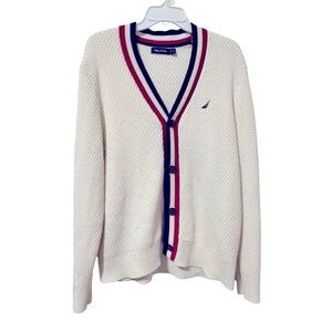 Nautica Cardigan Sweater Cotton Mens Sz XL Navy Crimson Trim Preppy Vintage