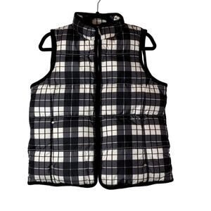 Chic checkered design. Sleeveless puffer style. Ideal for layering.