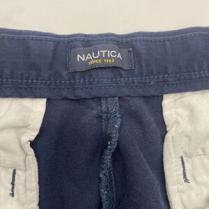 The design is solid in pattern, with accents of the Nautica logo. Suitable for summer, fall, or spring, these shorts are a classic fit for any man's wardrobe. The inseam length can be seen in the photos and description provided. These shorts are machine washable, making them easy to care for.