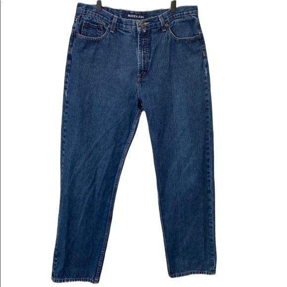 These rigid durable 100% cotton classic denim blue jeans are high rise and straight leg by Nautica Jeans.