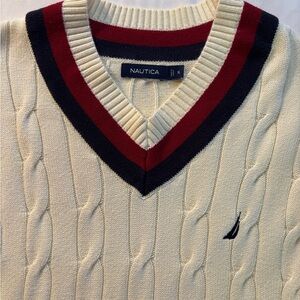 Nautica Cream and Red V-Neck Sweater with Ribbed Trim NWOT