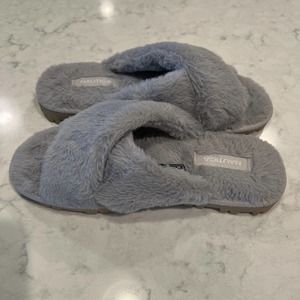 Nautica Fuzzy Women's Gray Cross Over Faux Fur Open Toe Slide Slippers Size 9