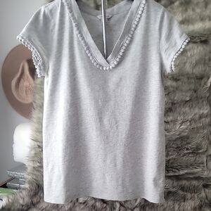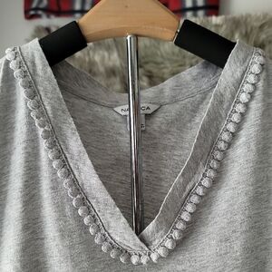 This Nautica tee showcases a stylish v-neckline and short sleeves, crafted in a soft gray fabric for a relaxed fit. The decorative trim along the neckline adds a subtle touch of elegance to this casual top.
