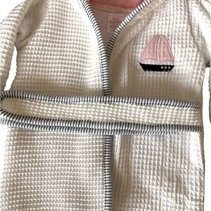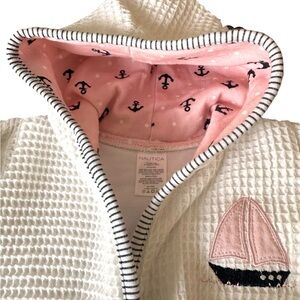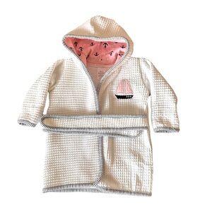 An absolutely adorable bath time robe for any precious baby girl. The exterior, interior and sleeves are a cotton blend for softness and comfort against the skin. The pink and blue sailboats hood is a contrasting color against the white add base. The robe comes with matching waist tie sash.