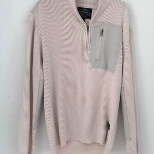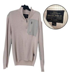 Nautica Jeans Co. Men's XL 1/4 Zip Sweater Beige Gray Ribbed Knit Elbow Patches