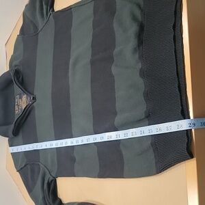 Nautica Jeans Co Size L 1/4 Zip Green Blue Striped Sweater, NJCo Crest on Arm. Great Condition, No Holes, Stains, Snags or Rips. Exposed Hems turn this Preppy Sweater into a Casual Piece. Please refer to measurements in photos to ensure proper fit.
