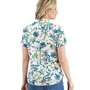 Refresh your everyday style with the Nautica Jeans Womens Floral-Print Cotton Camp Shirt. Designed with soft cotton fabric and a classic collared button-front, this breezy camp shirt is a versatile staple that pairs perfectly with jeans, shorts, or skirts. The floral print adds a pop of personality while keeping the look polished and casual.