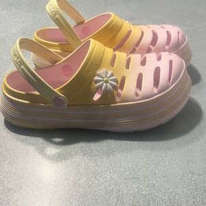 Charming pink and yellow sandals with a cute daisy detail. Comfortable and stylish for kids.