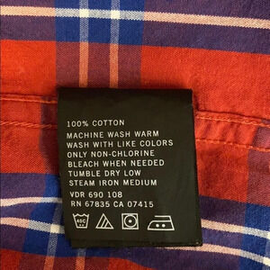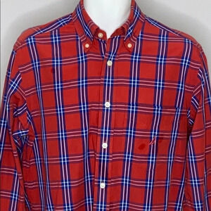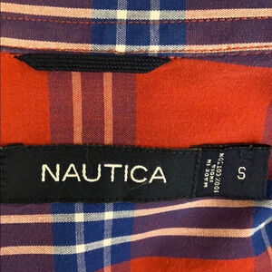 Nautica long sleeve plaid button down shirt in a size small. Red and blue plaid with a chest pocket with embroidered Nautica logo on it. Good pre-owned condition. Let me know if you need any measurements.