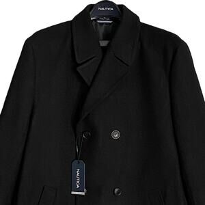 This listing is for a new with tags Nautica Men's 42 Regular Overcoat, Style ID Brass TN0000, in Solid Black. Wool Blend, Double-Breasted, Fully Lined, 2 Side Pockets, 3 Internal Pockets, Single Vent. 52% Wool. 41% Polyester, 4% Acrylic, 2% Rayon, 1% Nylon, Dry Clean Only. MSRP $395