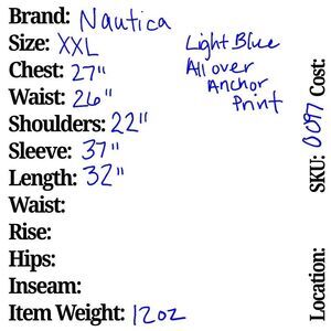 Make a statement with this Nautica men's dress shirt in a light blue color featuring an anchor pattern. The relaxed fit shirt is made of 100% cotton material with long sleeves, collared neckline, and button-down closure. It comes in size 2XL and has pockets for added convenience. Ideal for any beach or outdoor occasion, this shirt embodies a modern and preppy style that captures the essence of the American nautical theme. Get ready to set sail with this Nautica dress shirt.