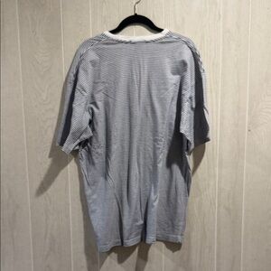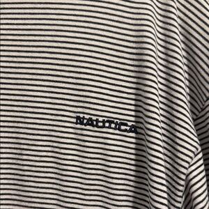 Classic short sleeve tee with black and white stripes. Nautica logo on chest. Ideal for casual outings.