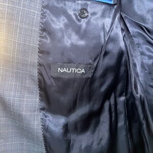 Stylish charcoal plaid blazer by Nautica. Ideal for business or casual events. Has a few small holes in the back but are not noticeable.