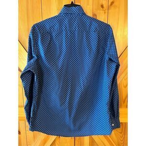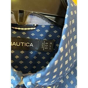 Nautica Men`s Classic-Fit Stretch Blue Geo Desy Long Sleeve Logo Shirt Medium Pocket pit to pit 22.5” length 27” (0563)