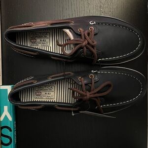 Classic Nautica boat shoes in dark blue. Features durable leather and secure lacing. Ideal for casual wear.