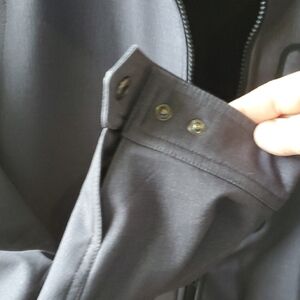 Sleek dark gray jacket with zip front. Includes chest and side pockets. Ideal for casual outings.