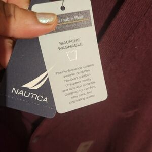 Classic Nautica cardigan in deep burgundy. Features button-up front and cozy fit. Ideal for layering.