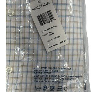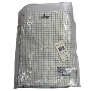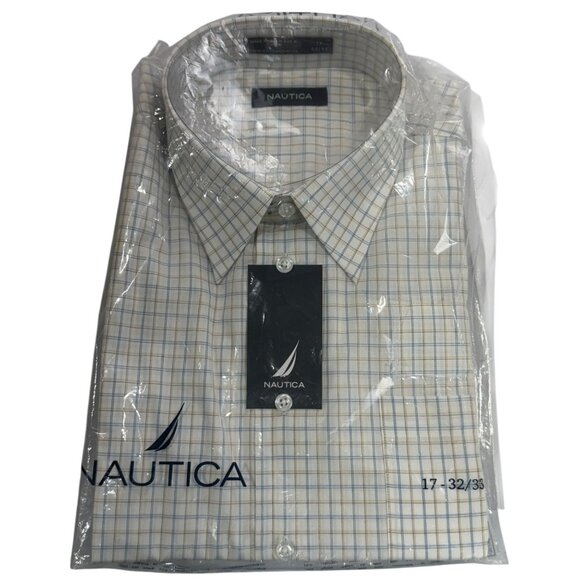 Nautica Mens Dress Shirt 100% Cotton White & Blue Plaid Button-Up Size 17 32/33