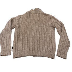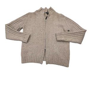 Thick and warm men's cardigan with a two-way, zip-up design for comfort and flexibility. It features a high neckline, ribbed cuffs and hemline. The knit is flat in the front and ribbed in the back and sleeves. It is in neutral shades of cream and tan. Wool and cotton blend. Washable and in excellent condition. Size Large.