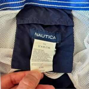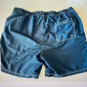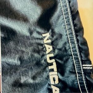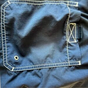 Stylish navy swim shorts by Nautica. Features a drawstring waist and side pockets. Perfect for beach or pool. Shorts have a 7 inch inseam. There is a little pocket on the inside for keys, etc. There’s also a mesh lining excellent quality.