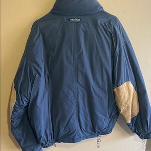 Stylish navy bomber with tan elbow patches. Features a high collar and buttoned front. Nautica craftsmanship.