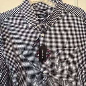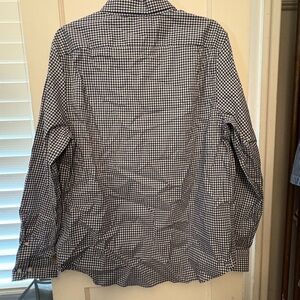 Classic navy and white gingham pattern. Button-down style and classic fit. New with tags and no flaws.