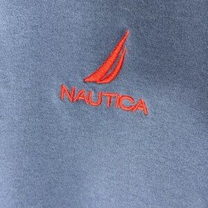 Classic Nautica polo in navy with red collar. Features embroidered logo. Stylish and comfortable. Used, good condition