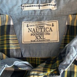Nautica Men’s Short Sleeve Button Down Shirt. XXL. Navy/yellow/green plaid. No missing buttons. Good condition.