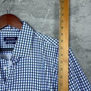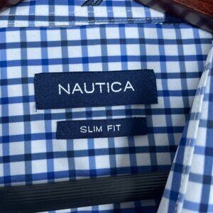 Men's checkered Nautica shirt in slim fit, size large 16-16.5. Soft, stretchy fabric with button closures, collared neck, and long sleeves. Made from polyester and spandex.