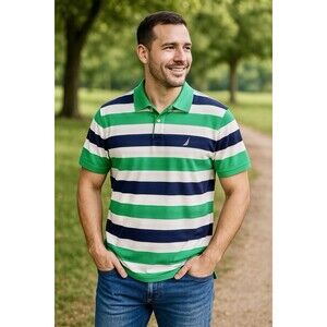 Nautica Mens Striped Polo Shirt Y2K Coastal Casual Preppy Sailboat Logo Sz Lg