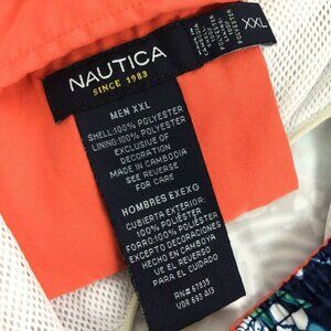 Nautica's 2XL blue swim shorts feature a vibrant floral sea life pattern. Crafted from durable polyester, they have an elastic waist for comfort and a mesh lining for quick drying.