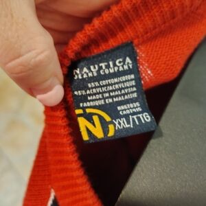 Gently used red, white, and blue sweater with nautical logo. No, holes or rips. Lying flat 25in pit to pit 30in shoulder to bottom.