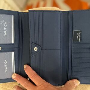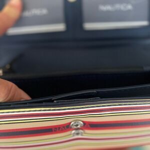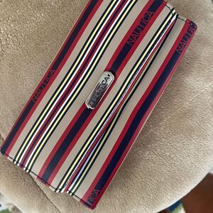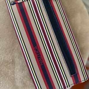 Chic wallet with bold stripes. Features Nautica branding. Ideal for daily essentials.