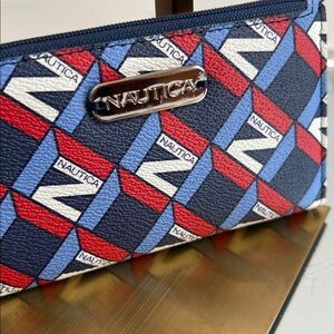 Chic wallet with bold red and blue design. Nautica branding on front.