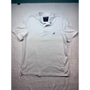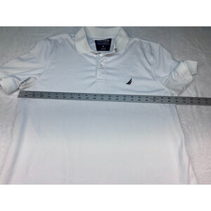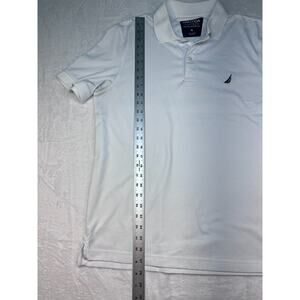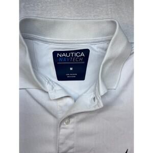 The Nautica Navtech Polo Shirt in White, size M, is a stylish and versatile garment perfect for casual occasions. Made of 100% polyester, this short sleeve polo features a collared neckline and the iconic Nautica logo as accents. Machine washable for easy care, this shirt is suitable for the summer, fall, and spring seasons. Designed for regular sizing, this men's polo is a classic and comfortable addition to any wardrobe. See photos for measurements