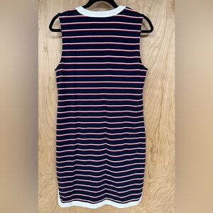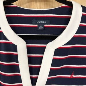 Nautica top with navy, red, and white stripes. Features a stylish V-neck.
