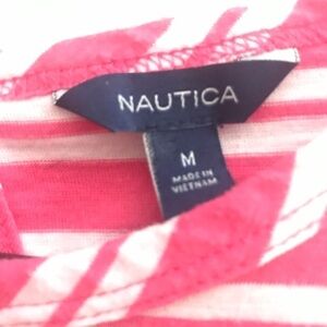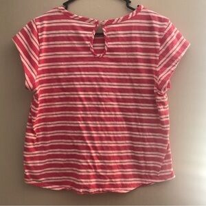 Pre-loved good condition Nautica Pink and White crew neck striped short sleeve tee with keyhole back with button fasten size medium