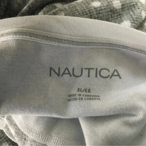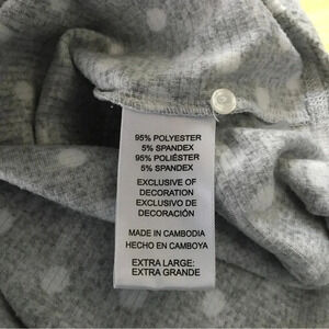 Nautica Polka Dot Sleep Shirt. Womens Size XLarge. Long sleeves. Gray with white polka dots. The top has a soft waffle knit feel to it. Buttons in the front. The top comes with a extra button. There is a tiny bit of pilling on the cuff of the sleeves. 95% Polyester, 5% Spandex. No modeling or trades. C21