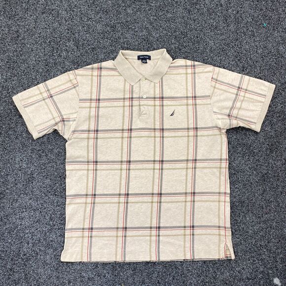 Nautica Polo Beige Short Sleeve Plaid Button Classic Shirt Mens Size Large