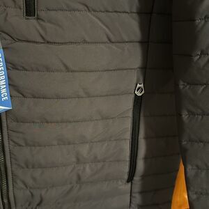 This is new with tags. The color is gray. Zipper chest pocket. 2 side zip pockets. The chest is 48 inches, 24 flat. The length is 29 inches with 27 inch sleeves. The fabric is 100 % polyester.