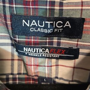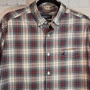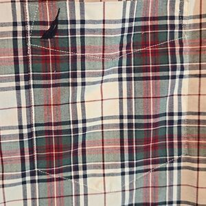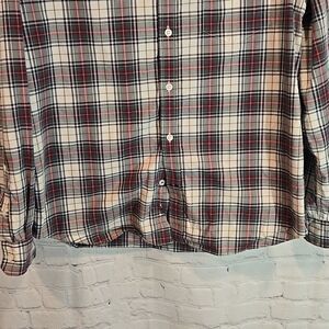 In very good used condition no flaws. Chest pockets with embroidered logo. White, red, green, and blue plaid