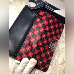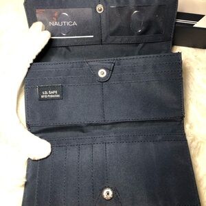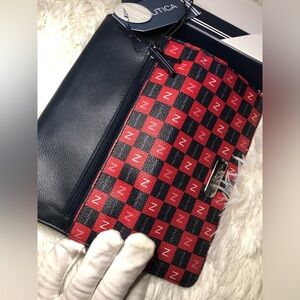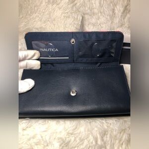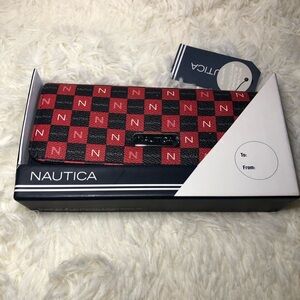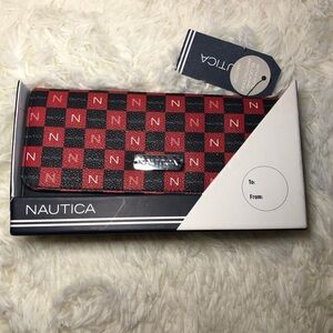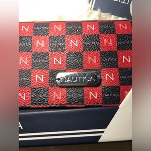 Nautica wallet with bold red and black checkered pattern. Features logo detail.