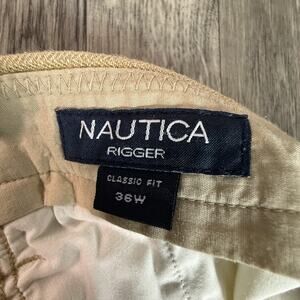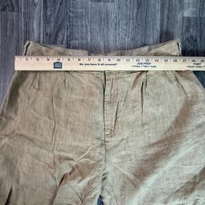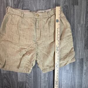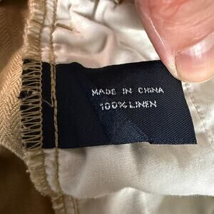 Ships out within 1 business day of purchase. Authentic Nautica Rigger men’s shorts in 100% linen fabric. Classic fit with front pleats, belt loops, zip-fly, back button welt pockets. Khaki / tan color. Lined portions at pockets. Clean seams, no rips or loose stitching. Great for warm weather wear and resort styling. Perfect pairing with polos, button-ups or casual tees.