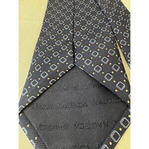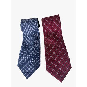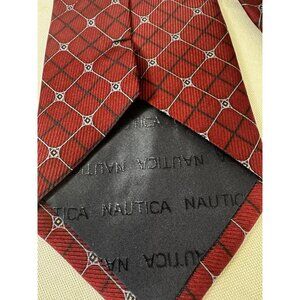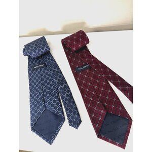 Nautica Set Of 2 Ties Navy Red Geo Diamond Print Preppy Heritage Business. A preppy and sophisticated set of two Nautica silk ties, perfect for the professional or heritage style enthusiast. The first tie features a deep navy blue background with a repeating geometric diamond and square pattern. The second tie is a rich red/burgundy with a diamond lattice pattern accented with white square elements. Both ties are crafted from luxurious 100% silk, offering a polished aesthetic suitable for business, formal occasions, or a classic wardrobe. 59" length and 4" width. Made in China. Excellent, pre-loved condition.