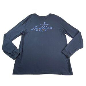 Nautica Mens T Shirt Size L Navy Blue Long Sleeve Spell Out Cotton Tagless Y2K.